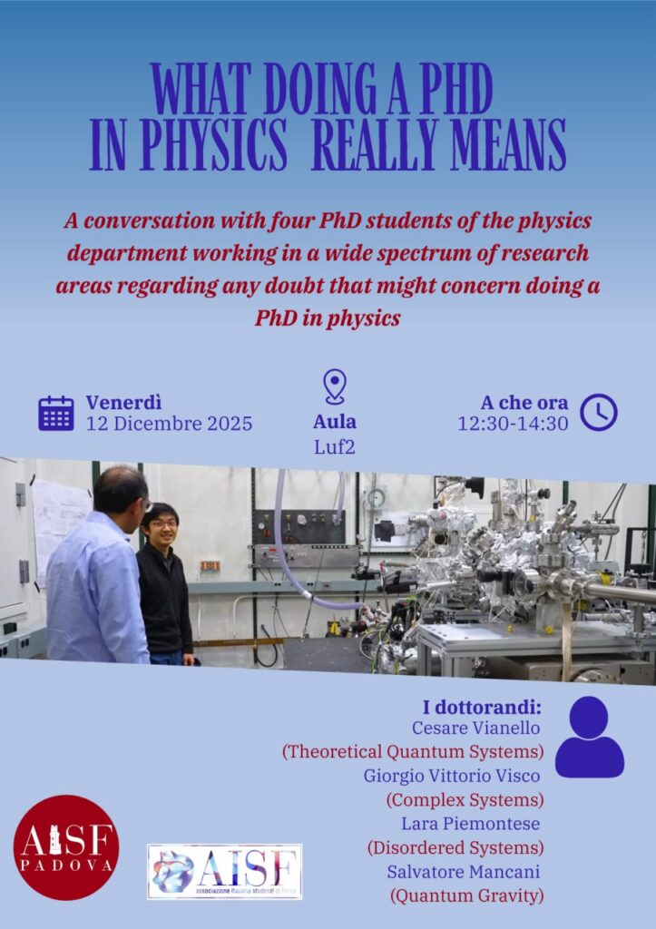 AISF Padova invites you to an informal chat with 4 PhD students from the Department of Physics, each coming from a different research field:  🌀 Complex Systems 👻 Disordered Systems  🧲 Theoretical Matter Physics 🌌Quantum Gravity